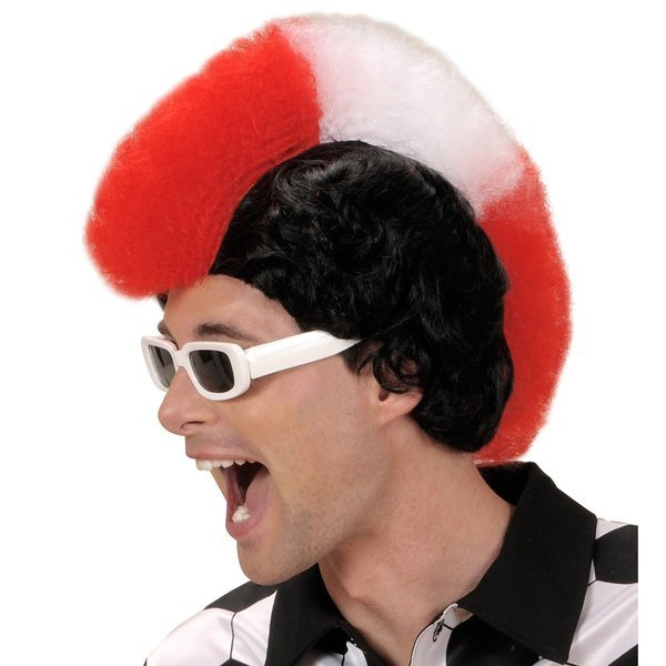 Peruka irokez kibica. Kolor: biały, czerwony. Mocowana na elastycznej siateczce.