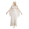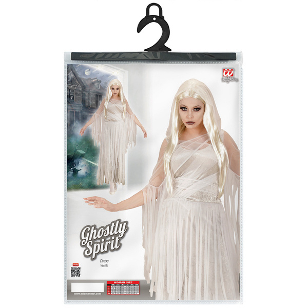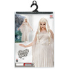 Sukienka koloru szarego, z doszytym białym przezroczystym kapturem.