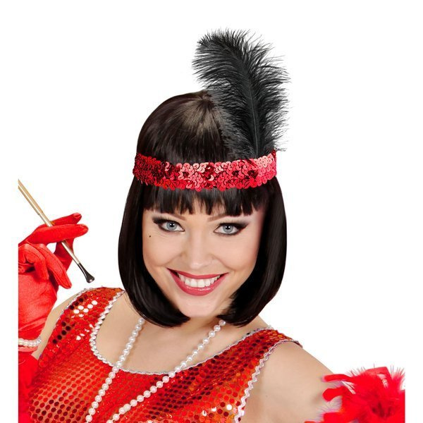Opaska w kolorze czerwonym z cekinami z ozdobnym czarnym piórem.