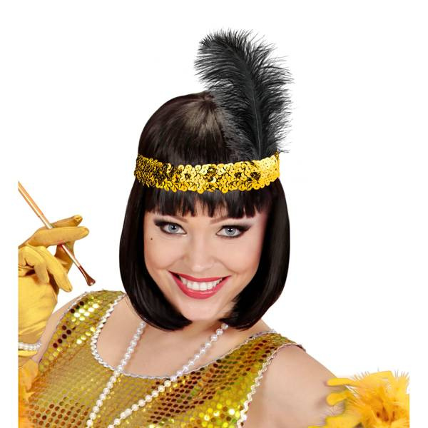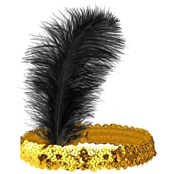 Opaska w kolorze złotym z cekinami i ozdobnym czarnym piórem.