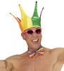 Tęczowa korona wykonana z materiału imitującego atłas, zdobiona koralikami.