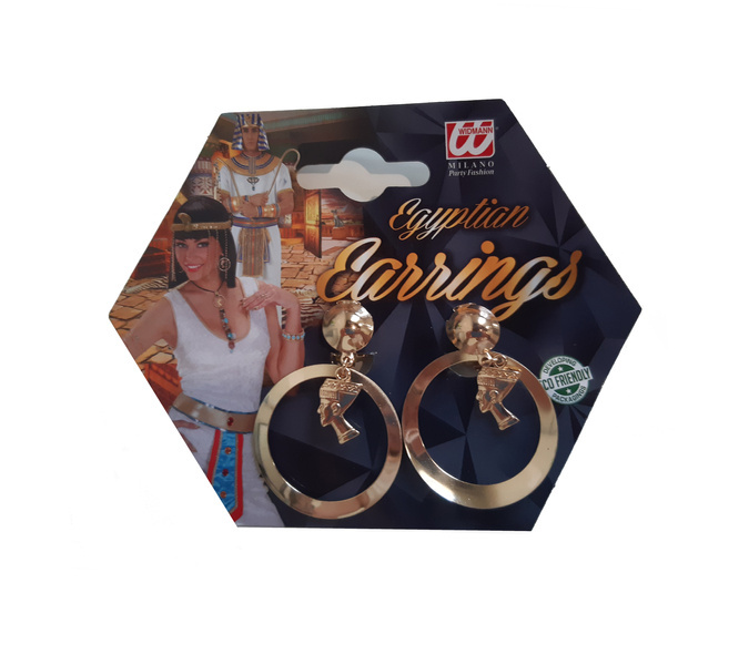 Okrągłe kolczyki w kolorze złotym z motywem egipskim.