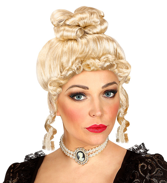 Peruka w kolorze: blond. Włosy ułożone w koka.Na bokach luźno puszczone loki.Peruka mocowana na elastycznej siatce.