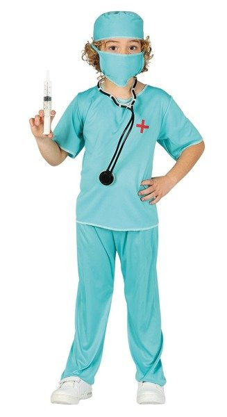 Bluzka niebieska z czerwonym krzyżykiem na piersi.