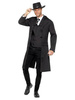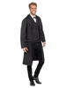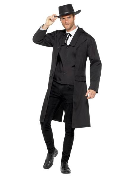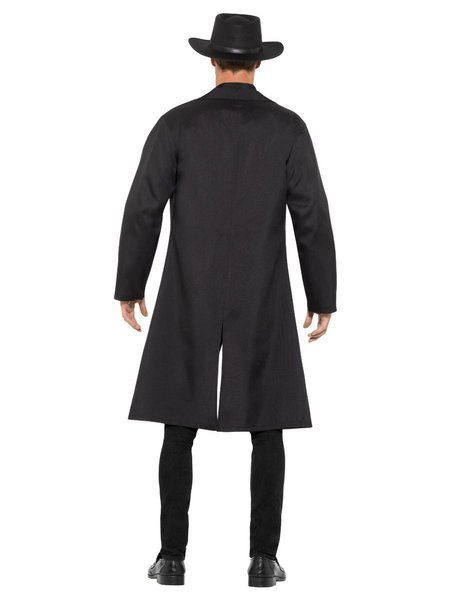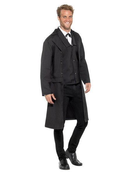 Długi czarny płaszcz z kołnierzykiem oraz imitacją kamizelki.