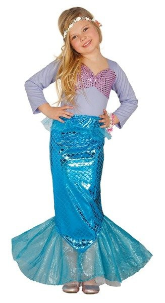 Spódnica w kształcie ogona syreny, niebieska z połyskiem, ozdobiona tiulową falbanką.