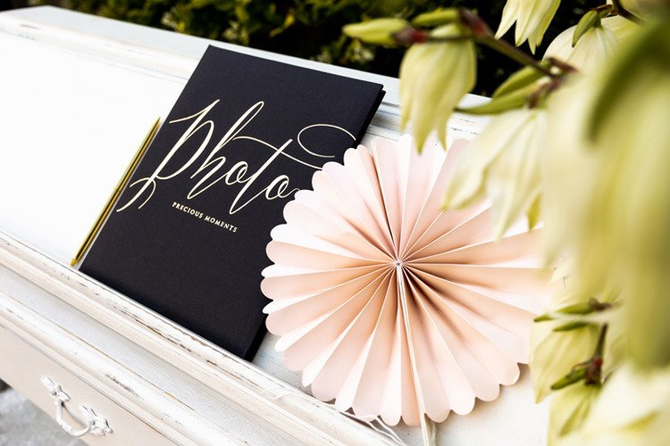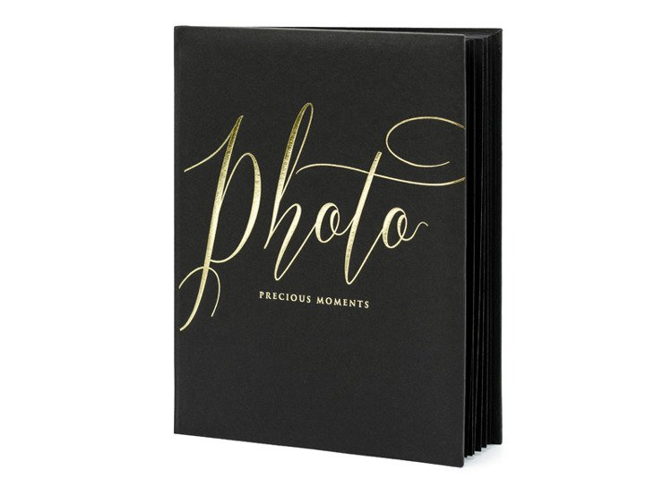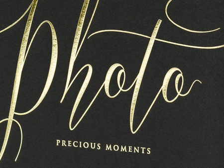 Album na zdjęcia oprawiony papierem w kolorze czarnym, ze złotym napisem Photo, precious moments, wymiary ok. 20 x 24,5 cm, 22 czarne kartki.