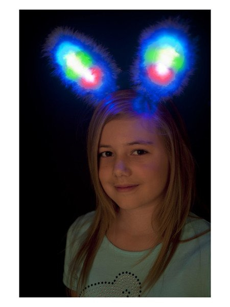 Uszy Króliczka, akcesoria, nakrycie głowy, kolor niebieski, uszy pokryte piórkami, świecące różnymi kolorami led.