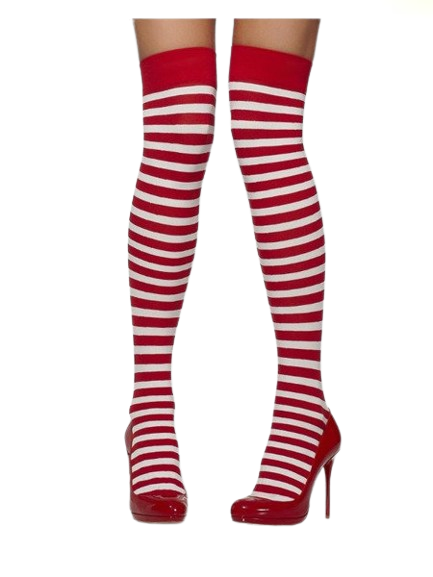 - Pończochy w przyciągający uwagę wzór czerwono-białych pasków.