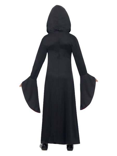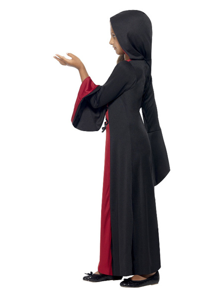 Długa sukienka z kapturem w kolorze czerwono-czarnym.