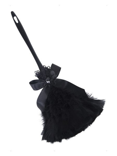 Miotełka pokojówki wykonana z plastikowej rączki oraz czarnych piórek. Ozdobiona kokardą.