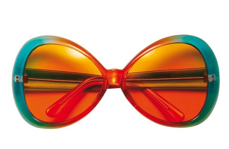 Okulary z pomarańczowymi szkłami. Szkła: plastikowe, styl "mucha". Oprawki: pomarańczowo-zielone, plastikowe.