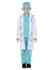 Biały fartuch z nadrukiem przyborów lekarskich.