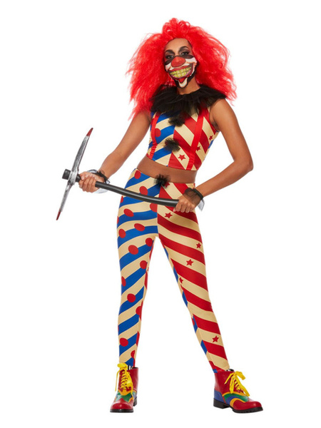 Strój w kolorze beżowym w czerwono-niebieskie paski.