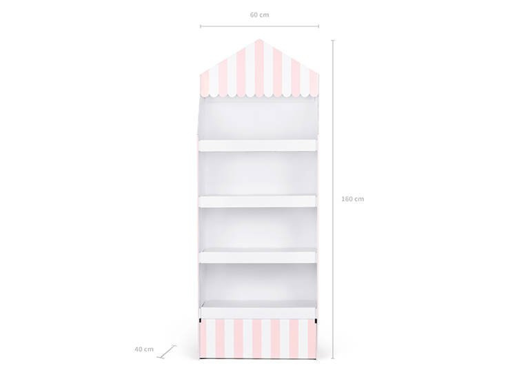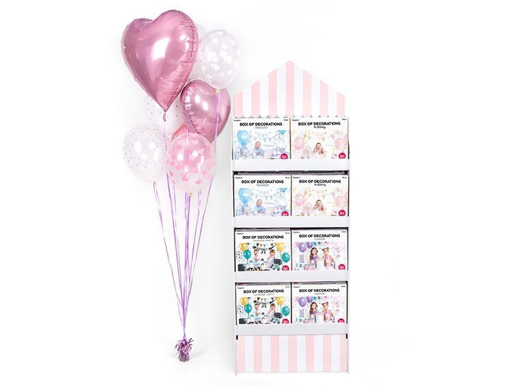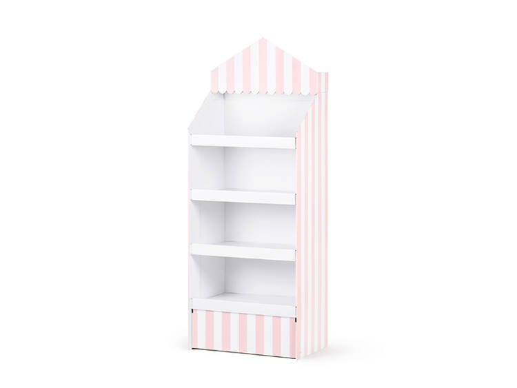 Stand papierowy, różowo-białe paski 1szt. Rozmiar wys. 160cm szer. 60cm głębokość 40cm. Idealny do ekspozycji setów z dekoracjami. Maksymalna ilość setów 48szt. / 8 kartonów. Do samodzielnego złożenia przez klienta.
