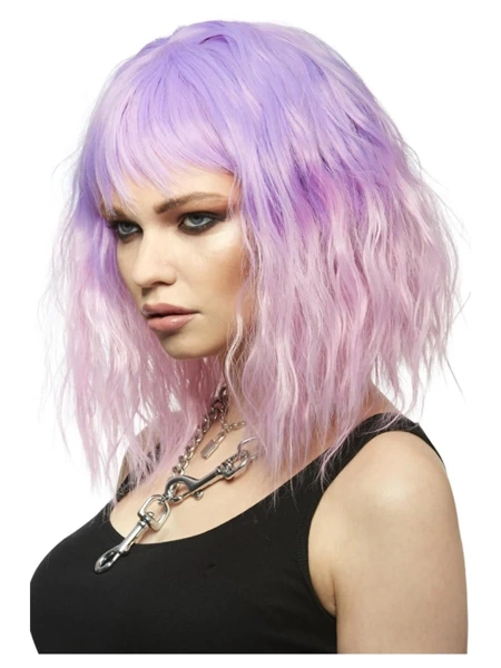 Peruka w kolorze różowo- fioletowym z grzywką.