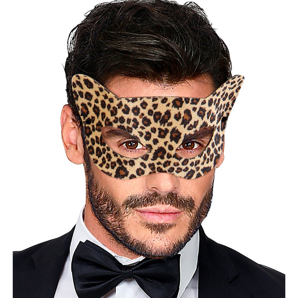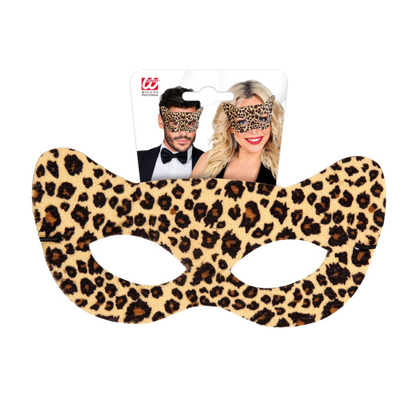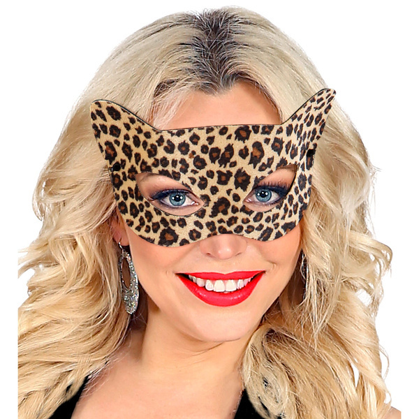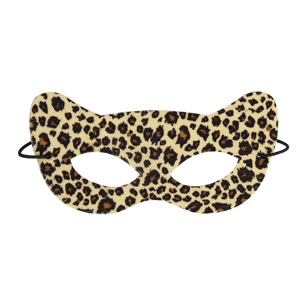 Maska wykonana z miękkiego materiału. Wycięta w koci kształt. Wierzchnia warstwa materiału w charakterystyczne lamparcie cętki. Maska zakładana na gumkę.