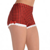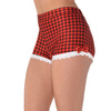 Szorty wykonane z materiału w czerwono-czarną kratkę.