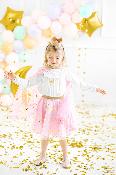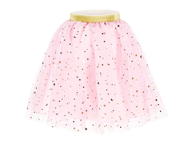 Różowa spódniczka ze złotymi elementami.