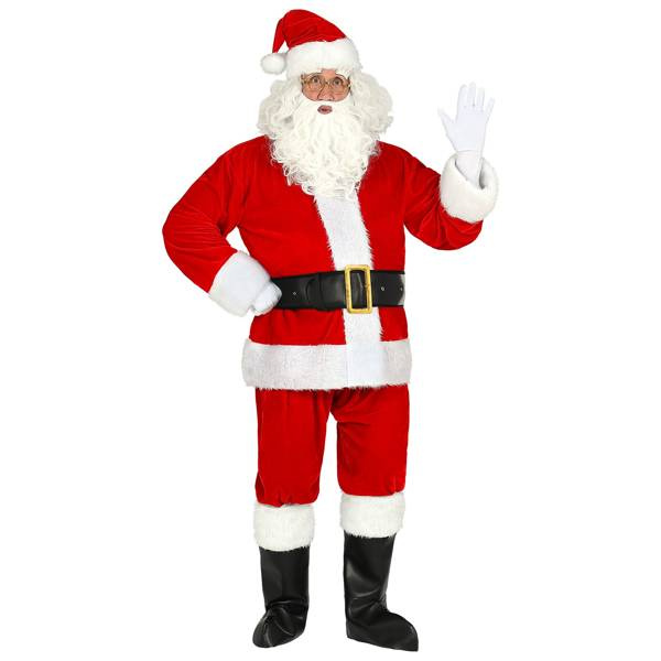Strój wykonany z czerwonego weluru z białym futerkowym wykończeniem.