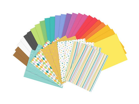 34 arkusze jednostronnie nadrukowanych papierów w intensywnych kolorach w teczce.