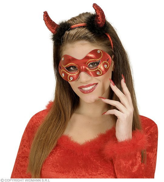 Maska w kolorze czerwonym, zdobiona koralikami. Mocowana na gumce.