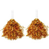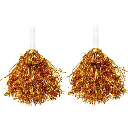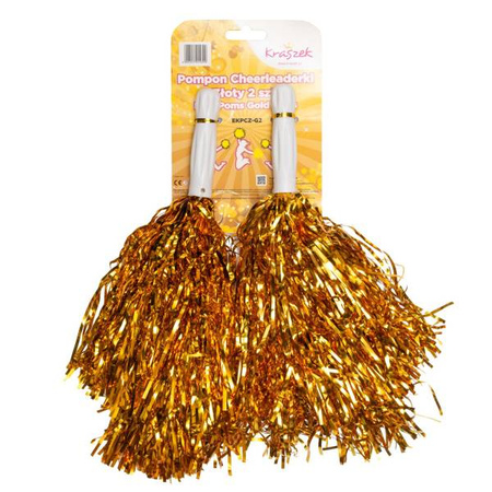 Pompony, 2 szt, wykonane z błyszczącej, złotej folii, z plastikową rączką do trzymania.