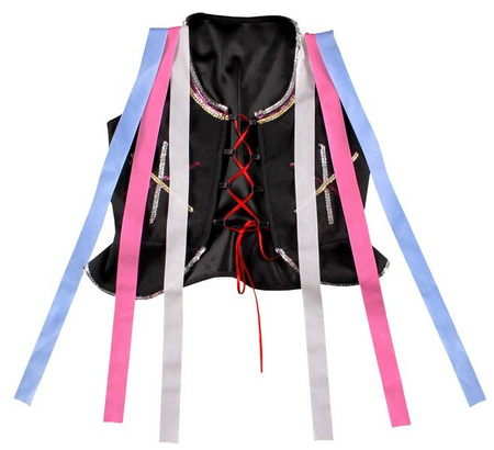 Kamizelka dziewczęca ozdobiona kolorowymi wstążkami, cekinami, wiązana tasiemką.