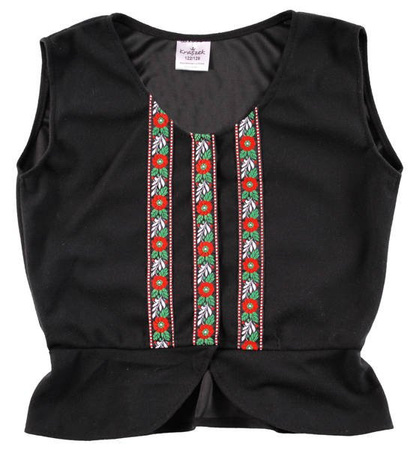 Kamizelka dziewczęca, ozdobiona kolorowymi taśmami, zapinana na rzepy.