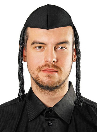 Czarna, czapeczka, jarmułka zakładana na czubek glowy z przyszytymi po bokach pejsami.
