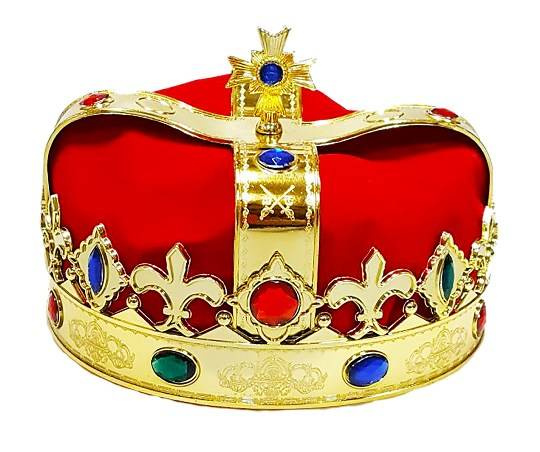 Plastikowa złota korona z czerwoną czapką z materiału.