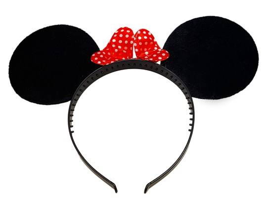 Opaska z czarnymi uszkami myszki, ozdobiona czerwoną kokardką w białe groszki.