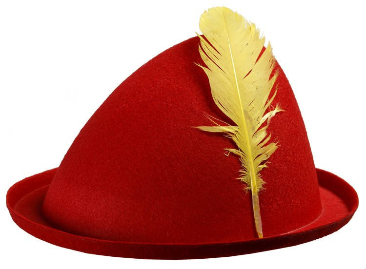 Czapka Pinokia w kolorze czerwonym z żółtym piórkiem.