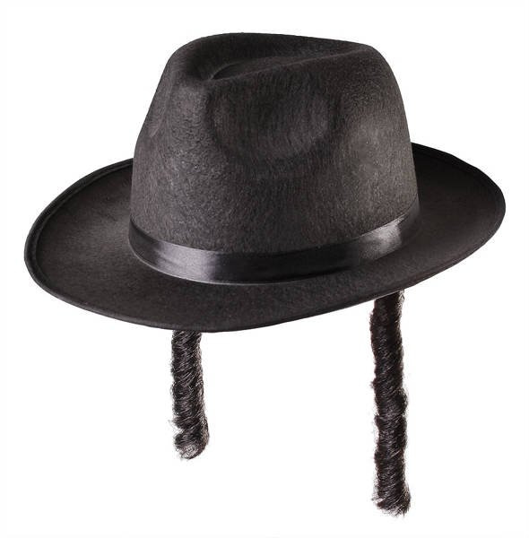 • Kapelusz z warkoczykami imitujacy tradycyjne nakrycie głowy żydowskiego rabina.