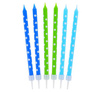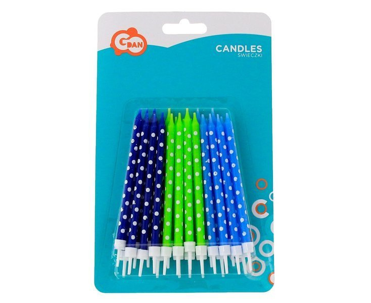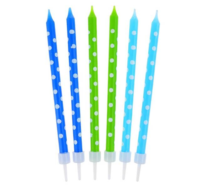 Świeczki urodzinowe Grochy w kolorach granatowym, zielonym i niebieskim.