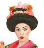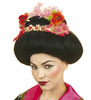 Peruka w kolorze czarnym, włosy uczesane w koka do góry, zdobione kwiatami.