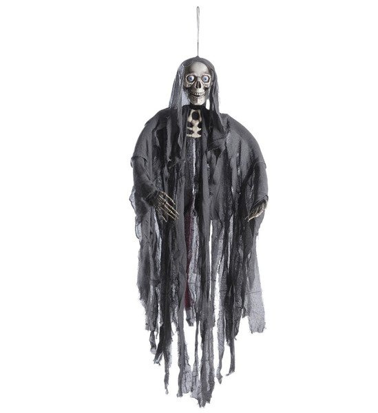 Kościotrup ma świecące oczy i wbudowany mechanizm, który wydaje straszne dźwięki.