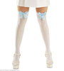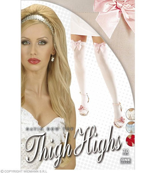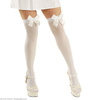 Białe pończochy, wykonane z wysokiej jakości nylonu. Ozdobione u góry różową satynową kokardką.
