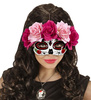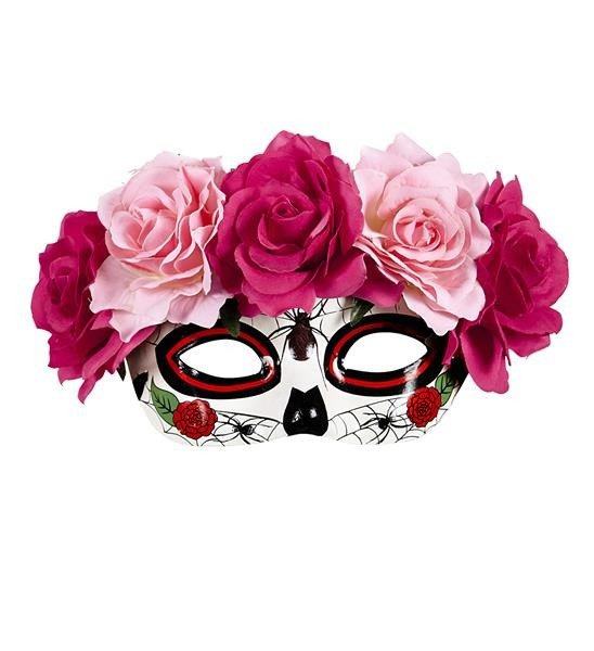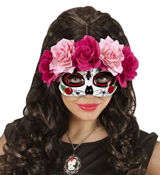 Maska na oczy z motywem pająka i róż. Kolor: biało-czarno-czerwony. Maska wykonana z twardego tworzywa sztucznego. Mocowana z tyłu na tasiemce.