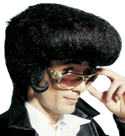 Peruka w kolorze: czarnym. Włosy proste, ułożone na stałe. Peruka mocowana na elastycznej siatce. Włosy są błyszczące, wyglądają naturalnie. Stylizowane na Elvisa.