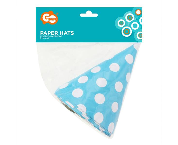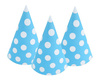 Czapeczki papierowe w kolorze niebieskim z białymi groszkami.