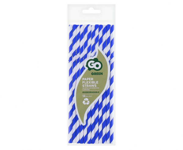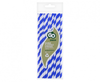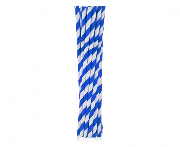 Słomki papierowe w kolorze niebieskim z białymi ukośnymi paskami.
