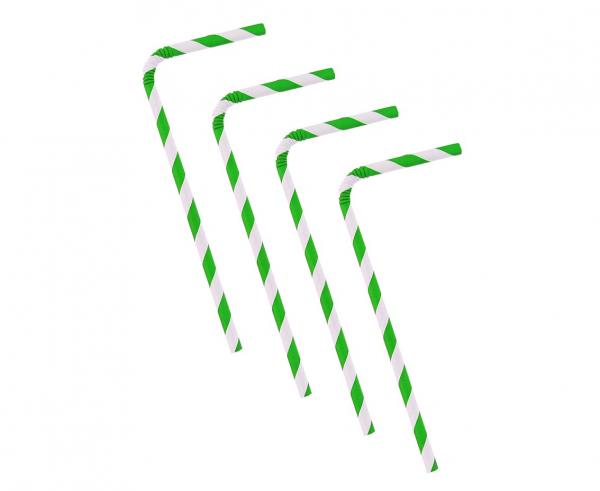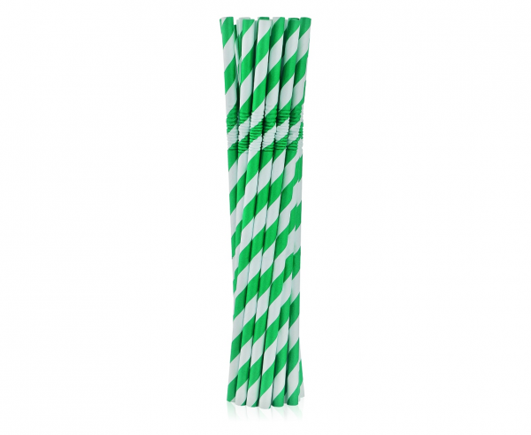 Słomki papierowe w kolorze zielonym z białymi ukośnymi paskami.