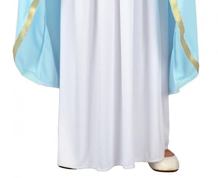 Strój dziecięcy dla Maryi został zaprojektowany tak, aby był nie tylko piękny, ale także wygodny – pelerynka z kapturem zapewnia łatwe zakładanie i pełną swobodę ruchów, a gładki, lekki materiał sukienki gwarantuje komfort podczas całego przedstawienia. Niebieski pasek dopełnia strój, podkreślając tradycyjny charakter postaci i nadając całości harmonijny wygląd.