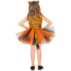 Sukienka pomarańczowa w cętki. W dolnej części czarny, ozdobny tiul oraz kokarda.