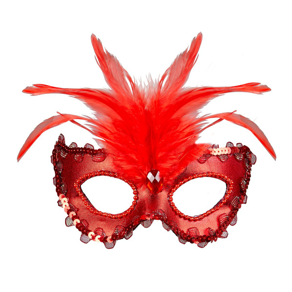 Maska z giętkiego tworzywa, zdobiona czerwonymi koralikami i cekinami. U góry na środku maski przymocowane są czerwone pióra. W masce wycięte są otwory na oczy. Mocowana na gumce.