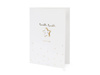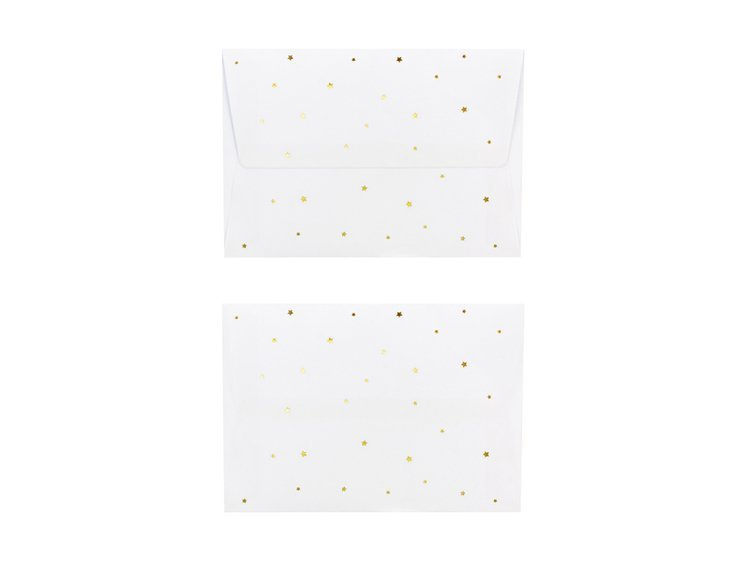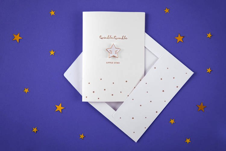 Kartka w białym kolorze ze złotym metalizowanym nadrukiem z pinem w kształcie gwiazdki i białą kopertą ze złotym metalizowanym nadrukiem, wymiary kartki ok. 10.5 x 14.8 cm, wymiary pina ok. 2.5 x 2.5 cm.