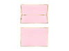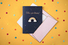 Kartka w granatowym kolorze ze złotym metalizowanym nadrukiem z pinem w kształcie tęczy i różową kopertą ze złotym metalizowanym nadrukiem, wymiary kartki ok. 10.5 x 14.8 cm, wymiary pina ok. 4.5 x 2.5 cm.