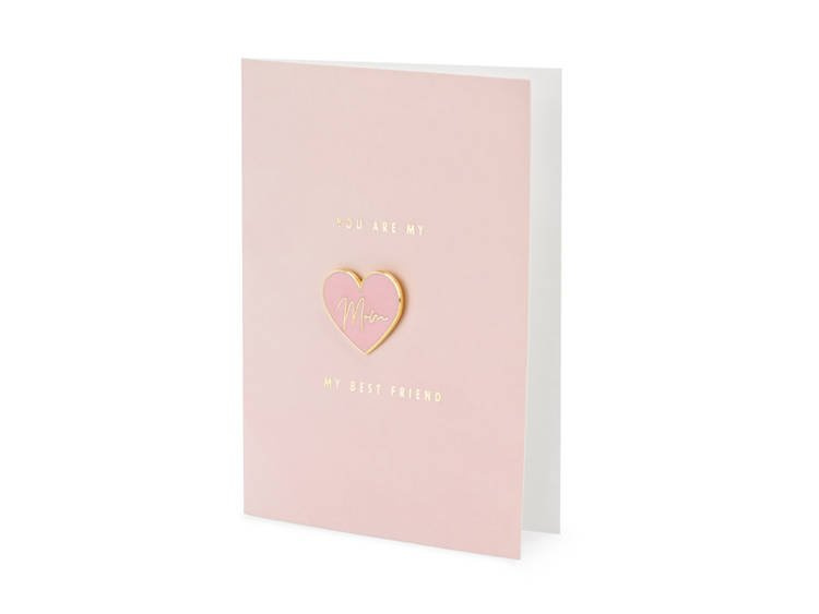 Z pinem w kształcie serca z napisem Mom i różową kopertą ze złotym metalizowanym nadrukiem.