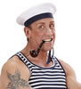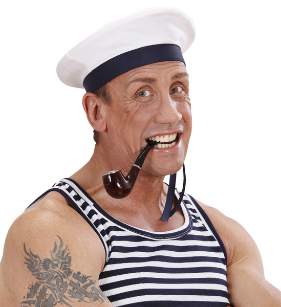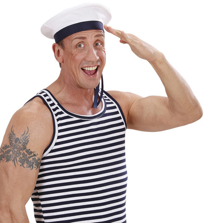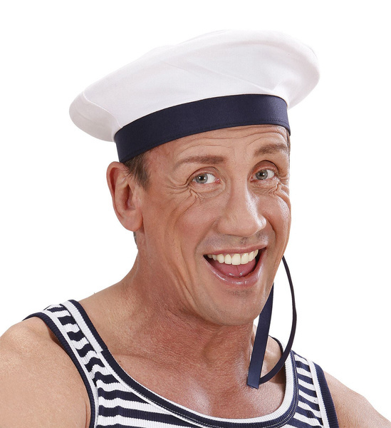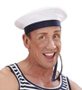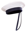 Mapka marynarza wykonana z białego materiału. Wykończona granatową obwódką dookoła głowy. Dodatkowo przepasana granatową wstążką.